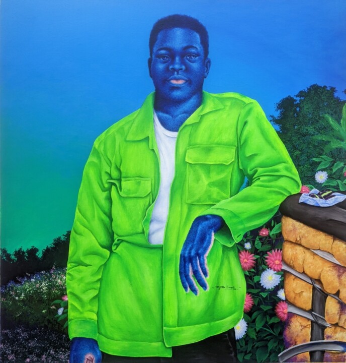 «Terre Natale» — это произведение искусства, которое я выбрал, чтобы воплотить в себе творчество Валентина Сирилла Эвега, камерунского художника 1998 года рождения, чьи портреты, выполненные на преимущественно синем фоне, призваны передать оттенок кожи его частично реалистичных моделей. В этом случае изображен мальчик в флуоресцентной куртке, опирающийся локтем на стену, оформленную в пышном зеленом цветочном контексте, где небо занимает большую часть фона. Вся сцена задумана так, как художник воспринимает жанр портретной живописи, а именно как средство исследования человечности и одновременно индивидуальности. Эта двойственность синтезирует способы существования, которые анализируются посредством представленного интереса как к узам любви и дружбы, так и к более одиноким и интроспективным взглядам на мир. Следовательно, человеческое состояние раскрывается во всей своей полноте, выходя за рамки расовых, этнических или гендерных различий, для анализа универсального опыта радости, печали, хрупкости и уязвимости, которые делают всех нас братьями и сестрами. Подводя итог, творчество художника-самоучки можно определить следующим образом: Валентин Сирил Эвег каждым мазком стремится передать глубокие сложности человеческого существования, привлекая зрителей к размышлению над вопросами, которые всегда сопровождали наш вид, давая жизнь в соответствии с концепцией общей человечности.