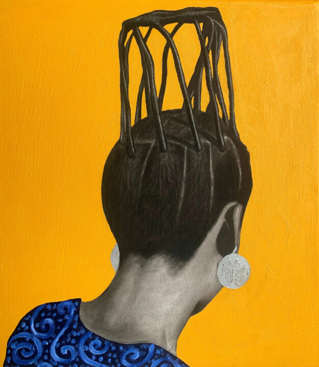 Сегодня гравитация исчезла, об этом все говорили в новостях. Первые эффекты можно увидеть в прическе модели Евы VI, изображенной нигерийской художницей Пелуми Фасаси! Если отбросить шутки, рассматриваемое фигуративное произведение, призванное увековечить женщину сзади, привлекая внимание к ее тщательно уложенным и высоким волосам, следует читать в корпусе женских портретов, задуманных для демонстрации красоты африканских женщин, а также креативность своих волос. В частности, последняя вместе с кожей изображенных предметов передается карандашом, а в одежде и фоне проявляется живопись. Говоря о Пелуми, молодом художнике с высшим образованием в области изобразительного искусства, его техника живописи, в основном с использованием бумаги и холста, а, следовательно, и древесного угля и акрила, направлена на добавление глубины и объема его работам, пронизанным постоянными отсылками к его культурным корням. Он, конечно, предпочитает практиковать свое искусство в вышеупомянутом жанре портретной живописи, поскольку это дает ему возможность тесно сотрудничать с моделями, которые вместе с художником создают реалистичное и достоверное повествование, призванное вовлечь зрителя в самую подлинную индивидуальность произведения искусства. Африканская культура.