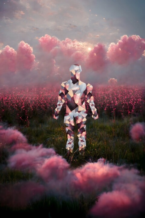 ЧЕЛОВЕК В ПОЛЕ РОЗОВЫХ ЦВЕТОВ 40X60 (2022) Цифровое искусство Кристи Белл.