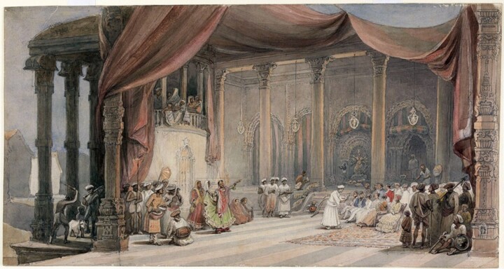Уильям Принсеп — Европейцы развлекаются танцорами и музыкантами в великолепном индийском доме в Калькутте во время пуджи Дурге. Коллекция: Британская библиотека. через Википедию
