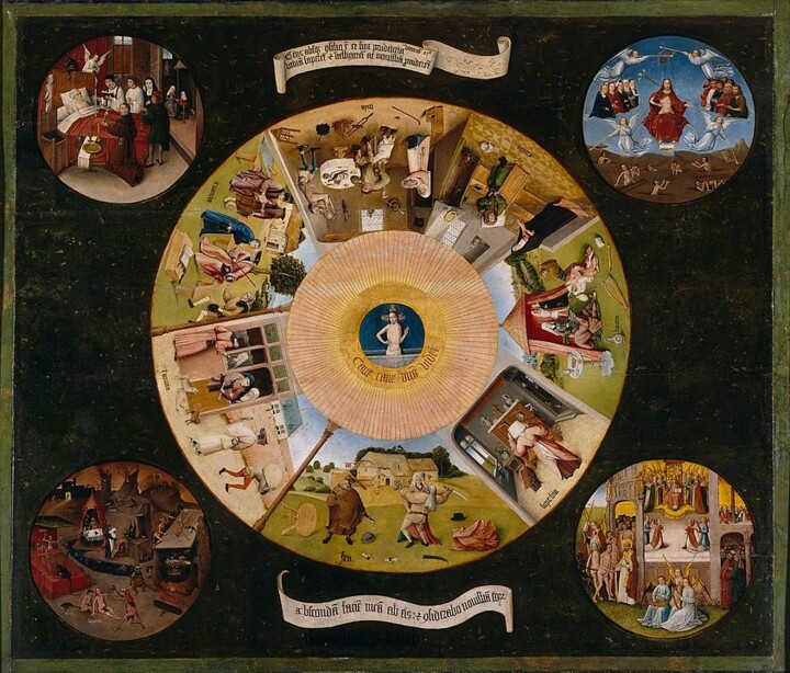 Иероним Босх, «Семь смертных грехов и четыре последних дела» , ок. 1500. Дерево, масло, 120см × 150см. Музей Прадо, Мадрид.