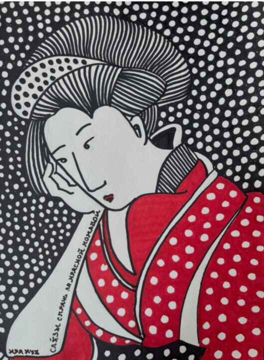 В работе Ирины Гвоздецкой из серии «Ира Куб Япония». Используя маркеры на бумаге, Гвоздецкая использует классические японские техники гравюры, чтобы вызвать у своих персонажей богатую палитру эмоций. Яркие цвета и замысловатые узоры, напоминающие культовый стиль Яёи Кусамы и традиционные японские плакаты, приковывают внимание зрителя. Каждый штрих маркера добавляет яркости и контраста, придавая каждой изображенной фигуре динамичность и индивидуальность.