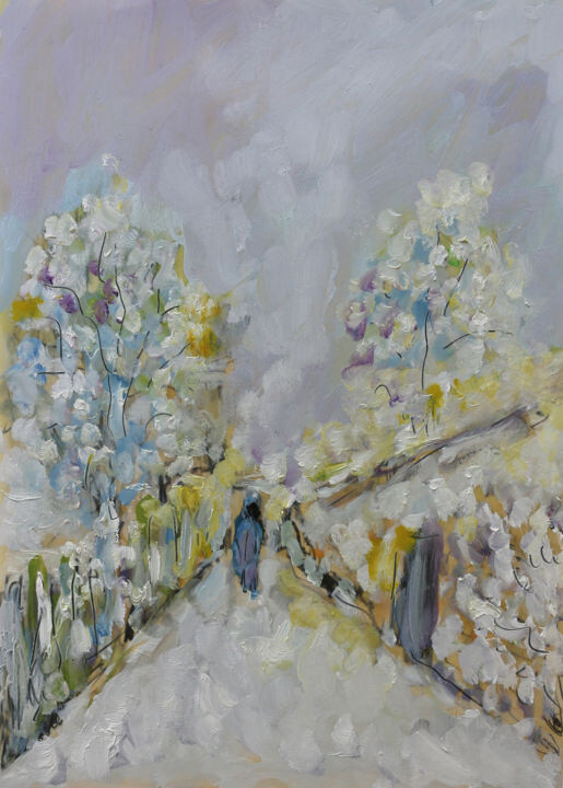 Самые откровенные белые и самые «грязные» белые торжествуют в композиции Мирре, внутри которой выделяется снежная аллея, которая, окруженная редкими деревьями, представляет, помимо одиночной и «схематичной» человеческой фигуры, специфические хроматические повторы, направленные на проявляющиеся в повторении желтого, фиолетового, зеленого и голубого цвета. В этом контексте, в котором временами виден и некий «подготовительный рисунок», а также явное наличие бумажной подложки, необходимо обратить внимание на способ растекания цвета, который чисто пост- В импрессионистской обстановке видны крупные штрихи цвета, которые в данном конкретном случае, кажется, намекают именно на самый ожидаемый погодный агент зимнего сезона: снег. Такой живописный прием отчасти напоминает использованный при создании шедевра схожей тематики: « Зимний пейзаж » (1909) Василия Кандинского, сцена простой композиции имеет сюжетом небольшой домик, расположенный в конце узкая тропинка, окаймленная деревьями, которые, лишенные листвы, явно напоминают о зимней обстановке, наряду со снегом, присутствие которого покрывает обе стороны тропы. Такая сельская обстановка передается через штрихи цвета, независимые друг от друга, которые выражаются через яркую цветовую палитру, в которой исследуются преимущественно тона розового, белого, желтого, синего, зеленого и голубого. Помимо способов нанесения цвета, шедевр Кандискского, как и картина художника Artmajeur, также дает возможность увидеть опору, которая в данном случае проявляется в краях произведения.