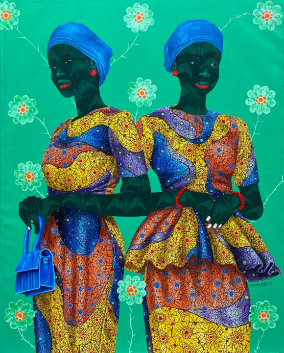 Яркий зеленый фон, обогащенный цветочными украшениями, подчеркивает присутствие двух женских фигур, создавая контраст, который подчеркивает их центральное положение. Самая захватывающая деталь — это прорисовка их кожи, изображенная темными оттенками, которые вызывают в памяти формы летучих мышей — повторяющийся символ в работах Афолаби. Этот элемент добавляет ощущение таинственности и глубины изображению, предполагая связь между главными героями и их стойкостью, а также намекая на концепции трансформации и адаптивности. Яркие цвета и симметричная композиция двух женщин усиливают тему солидарности и сестринства, фундаментальных элементов африканского общества.
