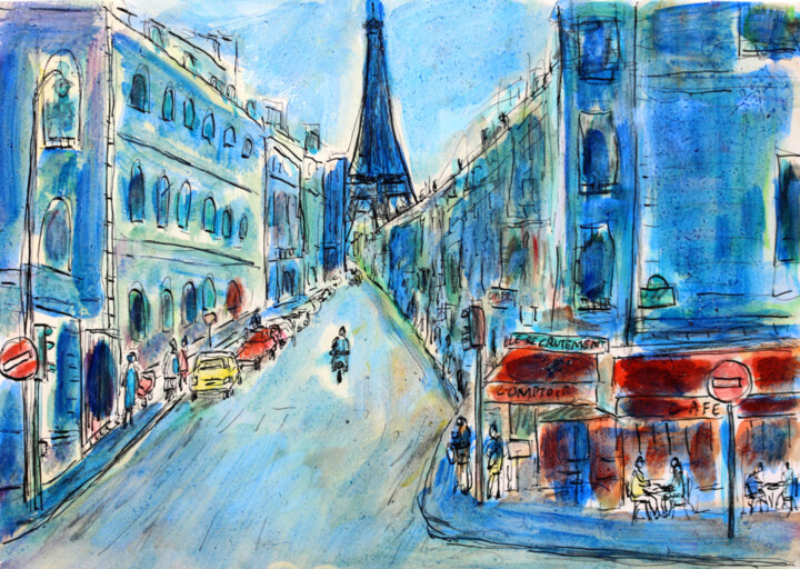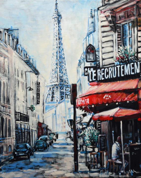 Я смотрел на картину Жана Мирра, мечтая оказаться на улице Парижа, которую он изобразил, но, чтобы продолжить свои мечты, мне страстно хотелось узнать, где на самом деле происходит действие этой картины. Я не знал точно, как узнать местонахождение, поэтому посмотрел на вывеску ресторана с надписью «Le Recrutement», надеясь, что это реальное место, способное связать мои мысли с чем-то конкретным. С этой конкретной целью я набрал «Le Recrutement, Paris» в Google Maps, и вот я перенесен на улицу Bd de la Tour-Maubourg, 36, на углу улицы, где я действительно могу полюбоваться башней на расстоянии. То, что я теперь вижу в изображениях упомянутой заявки, передано Мирре на его уникальном художественном языке, находящемся на полпути между импрессионизмом и фовизмом, всегда живым яркими красками, в данном случае тяготеющими главным образом к небесно-голубому и лазурному, с которым «Железная леди» стоит высоко в небе. Однако работы художника Artmajeur более разнообразны, охватывая порой более абстрактные или экспрессионистские формы, и все они призваны быть выразителями оптимизма, который характеризует художника как его преобладающее душевное состояние.
