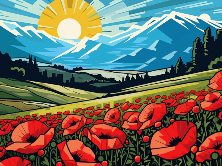 В представлении Косты Морра маки все еще присутствуют, яркие и живые под сияющим солнцем, но пологие холмы, которые когда-то были местом неспешных прогулок матери и ребенка, были заменены внушительными, стилизованными горами, в то время как небо передано в смелых, графических тонах. Природа действительно могущественна и доминирующа, но человеческий элемент полностью отсутствует.