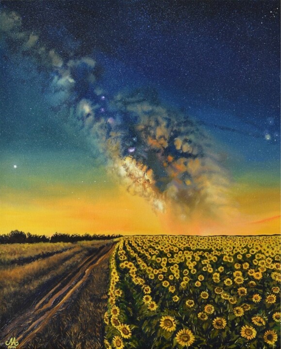 Работа Анны Мамонкиной, с другой стороны, переносит подсолнухи в совершенно иной контекст, напоминающий новую «Звездную ночь». Здесь подсолнухи больше не являются центром статической композиции, а помещены в обширный сельский пейзаж, пробуждающийся с первыми лучами рассвета. В этом временном интервале контраст между нарастающим дневным светом и звездами, все еще сияющими в небе, создает сказочную атмосферу, вызывая связь между землей и вселенной. Как будто сами подсолнухи участвуют в этом переходе между ночью и днем, отдавая дань уважения непрерывной красоте и надежде, которые приносит новый день.