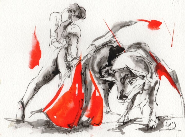 Чернила Жана-Люка Лопеса на бумаге рассказывают нам о конкретном моменте корриды, sacinto благодаря повторяющимся, неуловимым и близким встречам между быком и тореадором, которые заставляют зрителей затаить дыхание, которые, среди прочего, возможно, задаются вопросом: и животное переглядывается во время выступления? Наверное, да, и в стреге двух влюбленных, когда это происходит, игра, как и время, останавливается на очень долгое и напряженное мгновение, в котором души животного и человека соприкасаются друг с другом, признавая друг друга похожими, потому что они одушевленные тем же страхом потерять свою жизнь. Возможно, многочисленные изображения рассматриваемой темы у Франсиско Гойи были продиктованы и родственным желанием, направленным на раскрытие тайны того ощущения обмена душами, которое испанский художник исследовал в своей «Тавромакии» (1816), серии из 33 гравюр. , выполненные главным образом в техниках офорта и акватинты, показывают в основном жестокие сцены, происходящие в пространстве арены и переданные в формах смелых жестов двух одинаковых противников. Перспектива, исследованная этими гравюрами, учитывает точку зрения зрителя, поскольку кадр передан отсылая к нему, взятому наблюдать за сценой с трибун, как если бы ему вечно было любопытно постичь тайну, объединяющую души жертва и его палач.