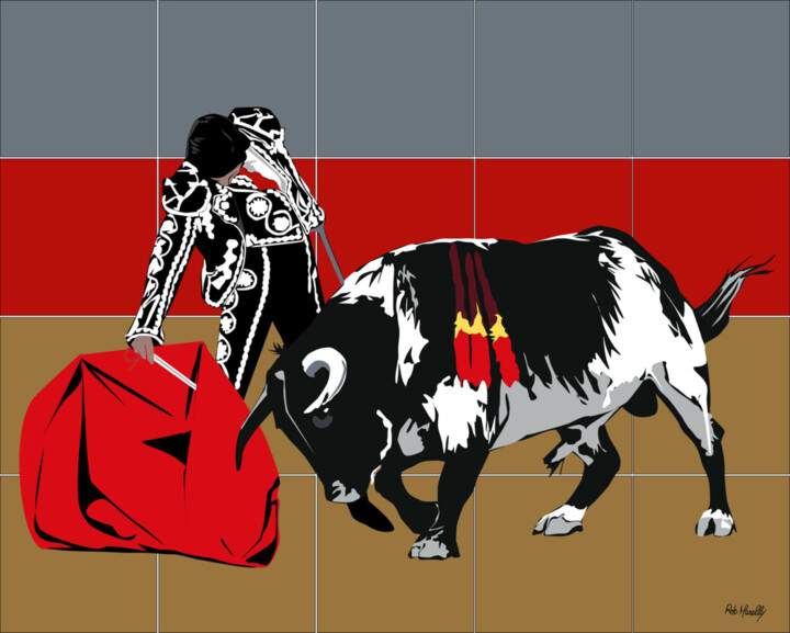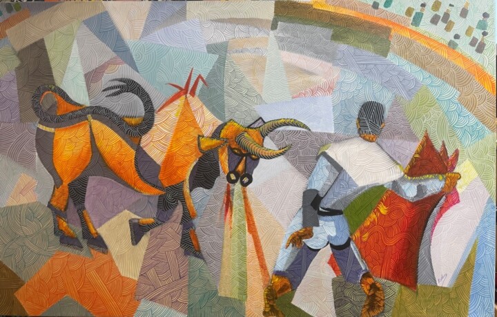 Тореадор, запечатленный на арене, состоящей из разноцветных фрагментов, словно танцует, выполняя те типичные танцевальные шаги, которые, ведомые напряжением, адреналином, а также желанием победить и выжить, заставляют его шаг за шагом уворачиваться от рога довольно разъяренного быка, из ноздрей которого отбрасывались полосы нереального красного цвета, вероятно, из-за крови некоторых его ран. То, что видно, заставляет нас «сожалеть» об утраченных первобытных отношениях, когда-то достоверно существовавших между человеком и животным, теперь окончательно прослеживаемых до древнего образа смельчака-пещерного человека. Что касается последнего, то интересно подчеркнуть, что он фактически уже был связан с своего рода изначальной формой художественного изображения быков, сюжетов, изображения которых, казалось бы, возникли почти одновременно с самим искусством, как это очевидно, например. , в результате раскопок в Чатал-Хуюке в Анатолии, месте, датируемом 6700-5650 гг. до н.э., где были обнаружены храмы, украшенные головами быков, а также мебель и колонны, состоящие из стилизованных бычьих рогов. Хотя цель корриды, однако, состоит в том, чтобы прогнать и убить быка, в этом контексте животное рассматривалось в довольно благотворном смысле, то есть как форма жизни, способная отразить зло, особенность, которая также проявилась позже. Это видно по парам быков с человеческими головами, которых обычно вырезали в качестве защитных существ на портиках важных зданий древних шумеров и в Ассирии. Тем не менее, в той же реальности доисторической Европы и древнего Ближнего Востока культ убийства быка был также довольно широко распространен, реальность, в которой животное, символ силы и плодородия, также часто было главным героем настенных боев. сцены.