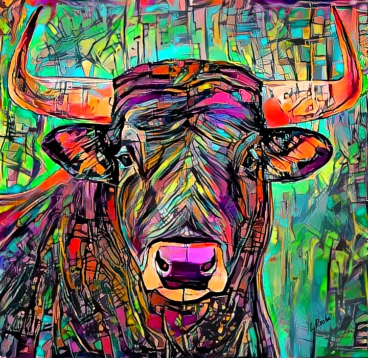 Бык Л.Роша, изображенный на переднем плане со стилистическими чертами, безошибочно близкими поп-арту, но решительно актуализированными языком цифрового искусства, становится очеловеченным предметом, почти как если бы он мог представлять собой изображение древнего и гордого члена семьи. , изображение, которое обязательно нужно разделить в гостиной, показать соседям, друзьям и различным гостям, чтобы с хвастовством вызвать древнюю славу рода, которая в этом образце достигла максимальной силы и мужественности. Здесь это описание позволяет нам понять всю многогранность рассматриваемой художественной темы, которая, например, такими художниками, как Пикассо, была расчленена через множество стилей и средств, в том числе через рисунок, случай, когда движение Изображение животного было подчеркнуто, достигнуто с помощью неряшливых линий, где тело, иногда перевернутое, всегда было готово снова подняться. Кроме того, нельзя не упомянуть, что это же млекопитающее появляется и в самой знаковой работе художника, а именно «Гернике», контексте, в котором животное становится символом Испании и ее традиций, а также, отсылая к традициям Древней Греции и Древний Рим, перенос вечной борьбы между инстинктом и рациональностью, между жертвенной уязвимостью и разрушительным импульсом, между защитой и нападением, жизнью и смертью, несомненно, присущий войне, на которую, как известно, намекает это произведение.