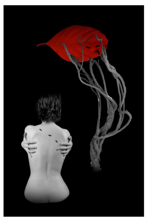 Рассмотрев вышеперечисленные жанры, еще раз выделю на примере творчества художников Artmajeur некоторые особенности съемки и композиции, которые всегда готовы задействовать и усилить красный цвет, за счет использования сочетаний с другими цветами, монохромными изображения, дополнительные цвета, аналогичные цвета, триадные цвета и контраст теплого и холодного. Чтобы в двух словах показать вам сочетание красного с другими цветами, я подумал о повторяющемся использовании красного и черного вместе, а иногда и красного с белым и черным, в фотографической базе данных Artmajeur, как и на сюрреалистической фотографии Эбигейл Гонсалес. Пина под названием «Параноидальное видение». В этой работе красный лист помещен как крона дерева, по которому, в этом конкретном преимущественно черно-белом контексте, также таинственным образом проходят трудолюбивые муравьи.