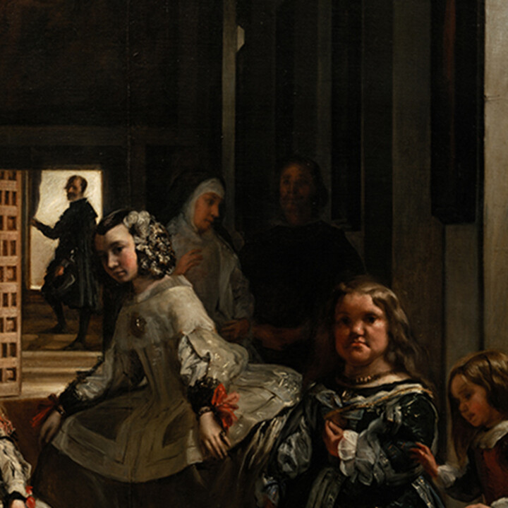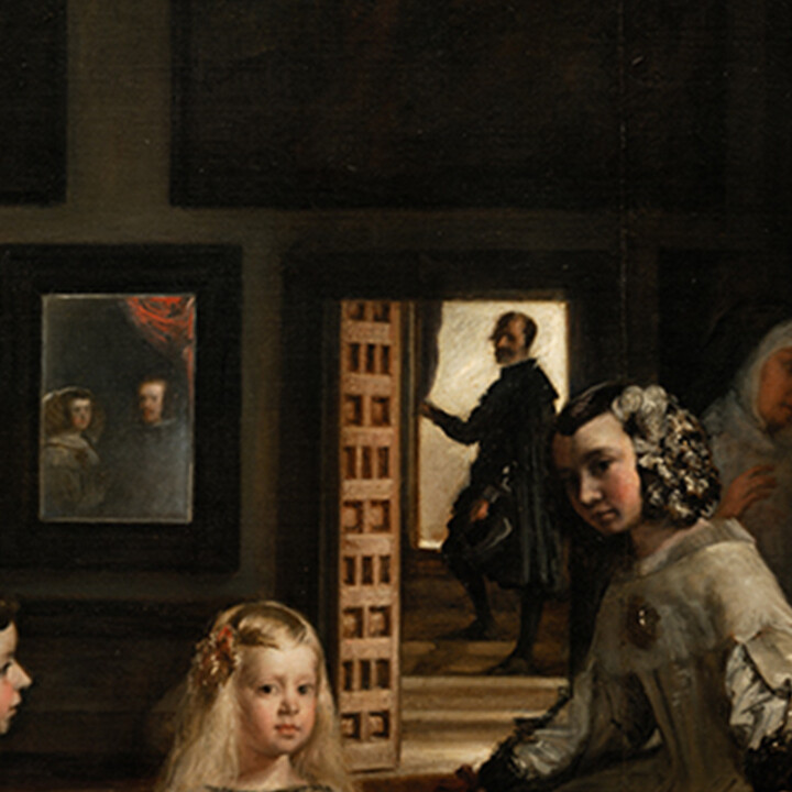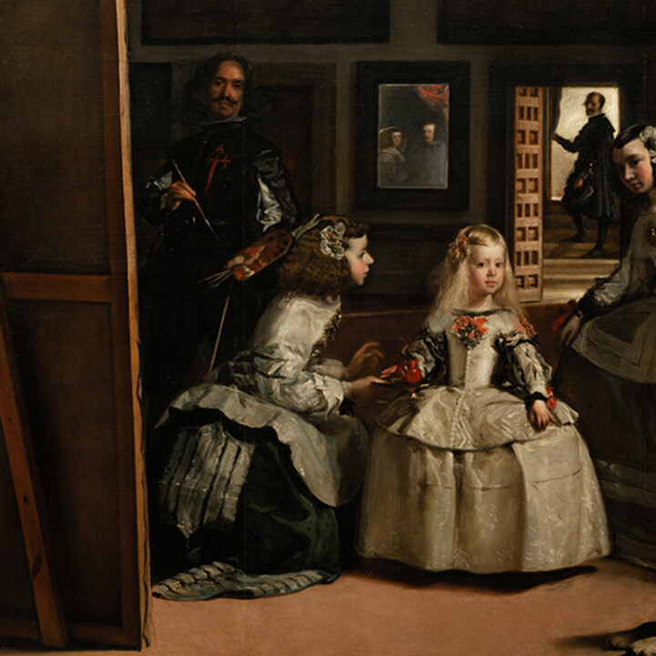 Испанский живописец показывает себя перед холстом, работающим над портретом королевской четы. Испанский живописец показывает себя перед холстом, работающим над портретом королевской четы. Он занимает место с левой стороны холста, демонстрируя уверенность в своей роли художника.