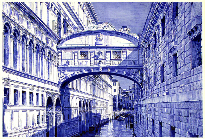 Картина: Сегодня вздыхают только по красоте рассматриваемого моста, точно запечатленного в оттенках синего и белого французским художником Анану, который стремился отдать дань уважения Венеции, реалистично воспроизведя одну из ее самых знаковых достопримечательностей. Что касается художника Artmajeur, Анану обычно создает тщательные рисунки, направленные на то, чтобы подчеркнуть композиционное мастерство, достигаемое в первую очередь за счет использования техники пера на бумаге. Этот выразительный способ исследует человеческую фигуру, а также животных, натюрморты, архитектуру и иногда даже абстрактные формы. Все это подчеркивает универсальность художника и его стремление постоянно развиваться, чтобы озвучить самые разнообразные аспекты реальности, выраженные прежде всего в оттенках синего и белого.