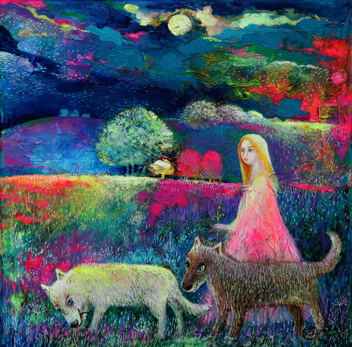 Как следует из названия самой картины, «Волшебная прогулка» изображает молодую девушку, намеревающуюся выгуливать своих двух волчьих собак, животных, которые сделали одну белой, а другую черной, что, вероятно, намекает на культовый и исторический дуализм дня и ночи. Кроме того, снова обращаясь к названию полотна, термин волшебный означает именно ту мечтательную, а также нереальную атмосферу, которую передает своеобразный детский стиль живописи, оживляемый невероятно яркими красками. В истории искусства другой художник рассказал о симбиотических отношениях, которые часто устанавливаются между животными и детьми, включая, в данном случае, зверей, которые обычно менее ручные, чем обычные домашние животные. Речь идет о произведении Эдварда Хикса «Мирное царство», написанном маслом на холсте около 1830 года, которое, выполненное в нескольких версиях, представляет собой интерпретацию библейского пророчества Исайи, а именно того, которое говорит о приходе мирного и Эдемского царства. , в котором с любовью сосуществуют добрые животные и доверчивые дети. Именно «внутренний свет» вышеупомянутого вида был способен, по мнению американского учителя, разрушать физические преграды, а также различия между живыми существами, чтобы добиться мирного разделения земного пространства. Говоря об Эдварде Хиксе, художнике, родившемся в 1780 году, хотя и являющемся представителем народного искусства, он известен своими наивными изображениями ферм и пейзажей Пенсильвании и Нью-Йорка, а также вышеупомянутым шедевром.