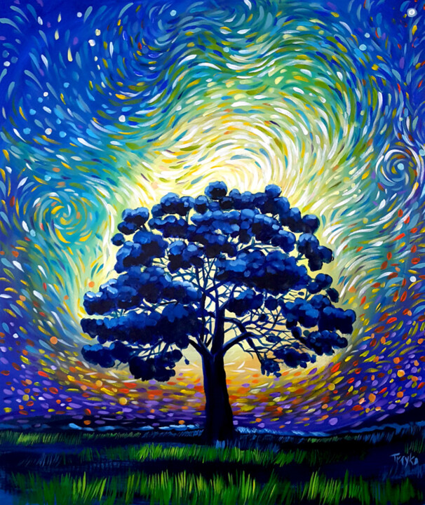 Вращающееся небо самого знаменитого «Ночного неба» в истории искусства — «Звездной ночи» Винсента Ван Гога — аналогично предстает в композиции Попова, где на переднем плане снова присутствует дерево. Однако, в отличие от шедевра голландского мастера, художник из Artmajeur поместил этот предмет в центр опоры, как уникального и бесспорного главного героя пейзажа, готового доминировать на холсте наряду с насыщенными цветами, среди которых зеленый и синий. выделяться заметно. Последний, кажется, особенно присутствует, поскольку художник нарисовал им небо, а также листву деревьев, а также часть травянистой земли. С точки зрения интерпретации, цвет моря передаст зрителю чувства холода, спокойствия, глубины, тишины, мира, чувствительности и тайны, а также баланса, последний аспект также касается восприятия зеленого цвета. . Что касается художника, Трайко Попов – болгарский художник, в чьих образных исследованиях, часто ироничных и сюрреалистических, часто доминирует создание игр света, принимающих форму красочных сюжетов, способных привлечь внимание зрителя и стимулировать его эмоции.
