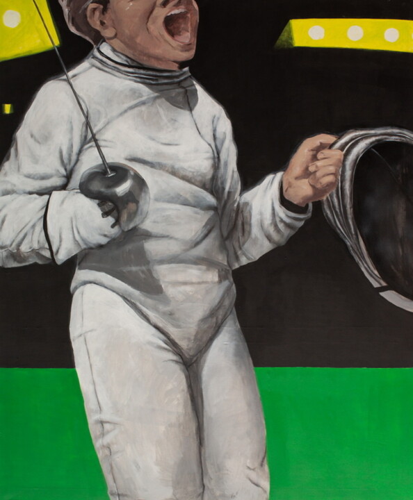 Спортсмен наносит удар своему противнику и выигрывает поединок, празднуя это с азартом. Это не одна картина, а две, входящие в серию художника, посвященную последовательным моментам фехтования, иллюстрирующую интенсивность и страсть этого вида спорта посредством ярких и эмоциональных деталей.