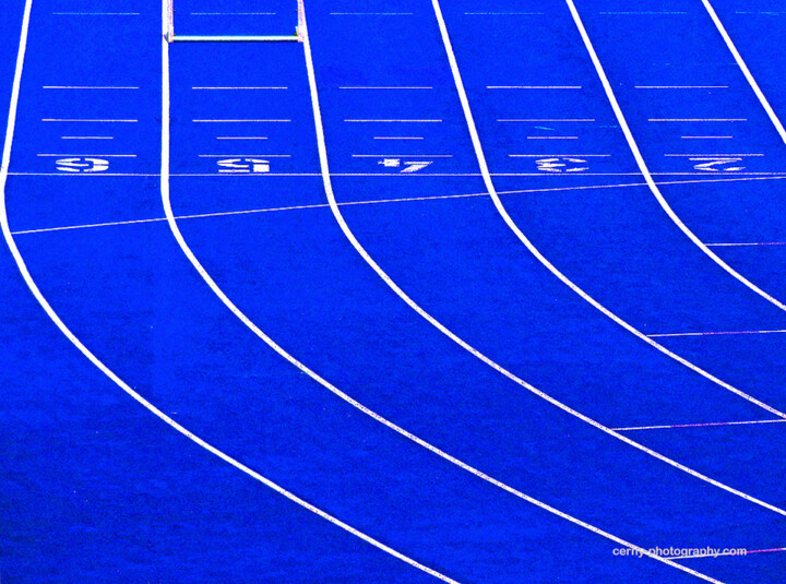 Первое изображение переносит нас на пустую трассу, место ожидания и потенциала, на которое смотрят нетерпеливые и взволнованные зрители, ожидая начала гонки, возможно, размахивая своим национальным флагом, потягивая пиво. «Гоночная трасса» запечатлела синюю гоночную трассу с помощью цифровой фотографии, сочетая передовые технологии с художественной интуицией, превращая простую трассу в яркую и насыщенную сцену. Изогнутые белые линии отмечают дорожки, создавая визуальный эффект, который направляет взгляд зрителя по пустой поверхности, наводя на мысль о затишье перед действием.