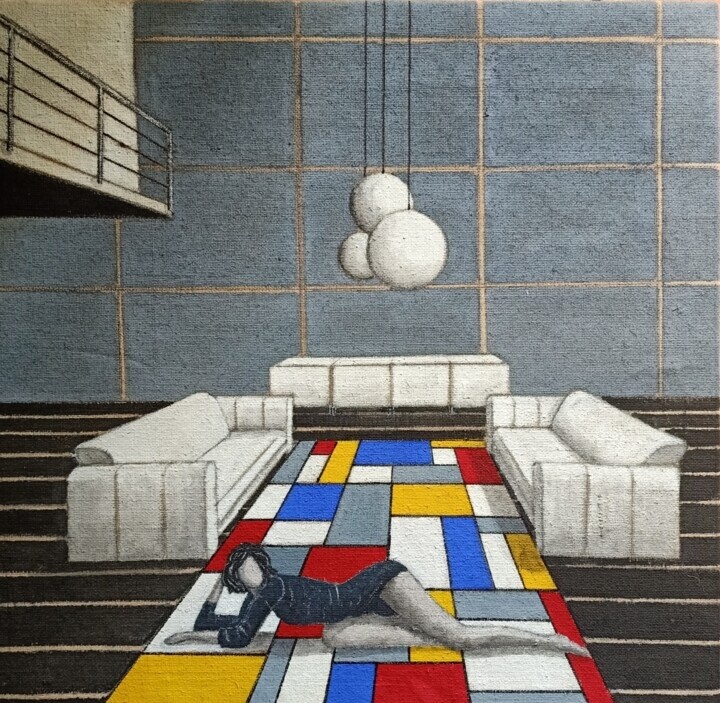 Работа художника Artmajeur Чунга представляет собой фигуративную версию одного из самых знаменитых неопластических шедевров Мондриана « Композиция с красным, синим и желтым» (1930). По сути, в этой оригинальной и уникальной версии вышеупомянутого полотна геометрия голландского мастера породила интерьер, в котором есть не только стены и желтый предмет, расположенный на переднем плане слева, но и фигура женщина, личность которой остается скрытой за густыми волосами, одетая в изысканные и элегантные красные платья. В этом новом контексте работа приобретает неотредактированные значения, ассоциируясь с более типичными изображениями интерьеров с фигурами, направленными на то, чтобы погрузить нас в частную жизнь людей. Однако, говоря о шедевре Мондриана, картина 1930 года включает в себя хроматическое использование красного, синего, желтого, белого и черного цветов, объединяя их в композицию, сведенную к простейшим прямолинейным формам квадрата и прямоугольника, которые определяются вертикальными и горизонтальными линиями. . Такой язык обозначен самим художником как «композиция», так как организация абстрактных и асимметричных форм на холсте конкретизирует синтез универсальных сил.