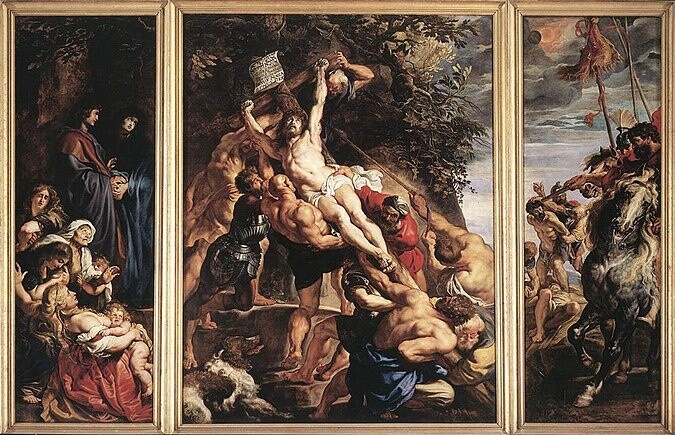 Питер Пауль Рубенс, «Воздвижение креста» , 1610-1611 гг. Дерево, масло, 462 см × 341 см. Антверпен: Собор Богоматери.
