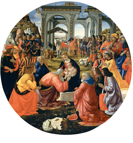 Доменико Гирландайо, Поклонение волхвов Торнабуони , 1487 г. Панель, темпера, диаметр 172. Флоренция: Уффици.