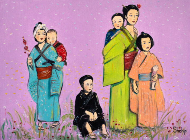 «Японские дети XIX века » Натальи Щипакиной — увлекательная картина, предлагающая взглянуть на культурное наследие Японии XIX века. Этот семейный портрет прекрасно передает невинность и очарование японских детей, одетых в традиционные наряды, возможно, напоминающие праздники Сити-Го-Сан. Написанные с мельчайшими деталями и яркими цветами, произведения искусства вызывают чувство ностальгии и культурного богатства.