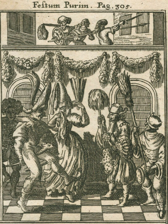 Гравюра на дереве 17 века с изображением Пурима, «Philologus Hebræo-Mixtus», Утрехт, 1657 год. Автор: Иоганн Леусден. через Википедию