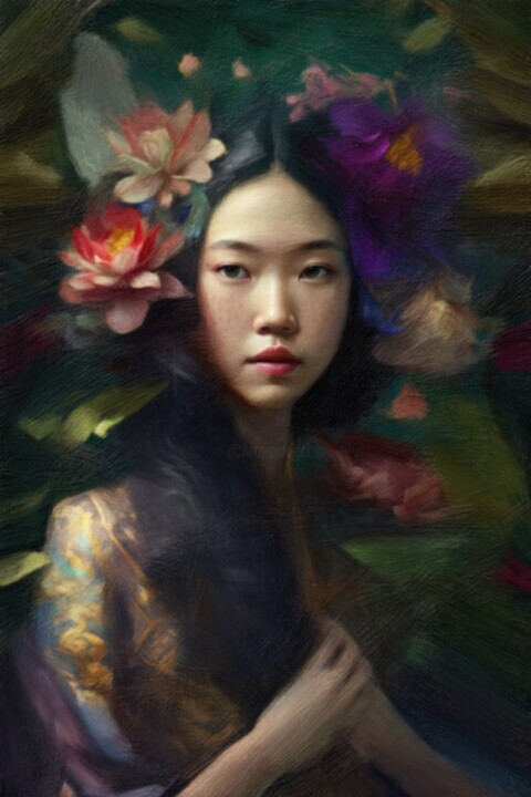 Чанъэ, китайская богиня Луны. Женщина эпохи Возрождения (2023) Джерри Мартинеса — это увлекательное цифровое произведение искусства, которое переосмысливает Чанъэ, изящную хранительницу Луны в китайской мифологии, как женщину эпохи Возрождения. Используя технологию искусственного интеллекта, художница воплощает в жизнь очаровательную историю о Чанъэ и ее значении в китайском фольклоре в современном контексте. На картине Чанъэ изображен элегантно и уравновешенно, олицетворяя мистическую привлекательность и спокойствие, связанные с Луной. Связанное с Фестивалем середины осени, одним из самых важных праздников в китайской культуре, произведение искусства прославляет Чанъэ и ее вечное присутствие на Луне. Во время этого фестиваля семьи собираются вместе, чтобы разделить лунные пряники и зажечь фонарики, символизирующие единство семей под сиянием полной луны. В исполнении Мартинеса вневременная история Чанъэ выходит за рамки древней мифологии, находит отклик у современной аудитории и продолжает вдохновлять изображением красоты, жертвенности и вечной любви.
