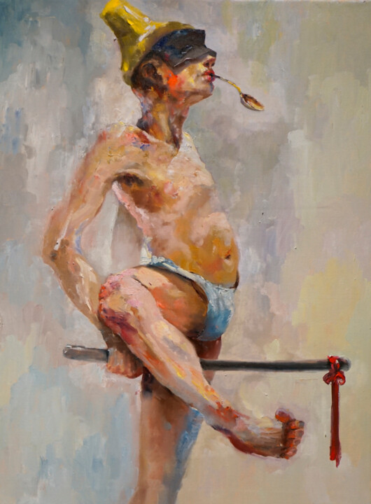 Мазки цвета, нанесенные по-разному, иногда напоминающие вкрапления, создают подобие акробата, просто балансирующего на одной ноге, а другая, согнутая сама на себя, держит под собой странный и неоднозначный посох. Все это происходит, когда он в нижнем белье, в шапке, маске и держит во рту золотую ложку. Возможно, эта последняя деталь была создана в связи с поговоркой «родившийся с серебряной ложкой во рту», предназначенной для обозначения людей с высоким социальным статусом. Возвращаясь к применению цвета, он напоминает импрессионизм, художественное движение, в котором использовались быстрые, плотные мазки, с прикосновениями цвета, расположенными рядом, иногда не смешиваясь и не накладываясь друг на друга, где свет, пространство и формы создавались исключительно с помощью цвета. Говоря о пятнах, возможно, было бы также уместно вспомнить Маккьяйоли, итальянских «импрессионистов», чья кисть создавала перекрывающиеся цветные пятна, чтобы определить массы света и тени. Что касается Филина, то творческий путь живописца начался в тихом городке на Волге, где его ранние произведения преимущественно вращались вокруг пейзажного жанра. Однако у него всегда было стойкое желание уловить суть человеческой фигуры, исследуя ее движения и эмоции, до такой степени, что эта тема действительно стала основным направлением его творчества.