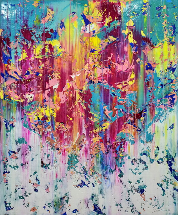 Небесный фон разделен на верхнюю и нижнюю часть. В верхней части опоры наблюдается взрыв цвета, выделяющийся динамизмом желтого, фуксии, синего и оранжевого цветов, а внизу — почти вездесущий слой белой краски, который иногда ломается, обнажая то, что есть на самом деле. под. Эту абстракцию описал и сам художник, который активно вовлекает зрителя и выражает ее в таких словах: «Погрузитесь в мир яркого искусства с «Абстракцией 23105», абстрактной картиной, представляющей собой взрыв ярких и смелых красок. .» Следуя этим соображениям, художник описывает свою богатую красочную импасту как своего рода трехмерный эффект, способный добавить глубину окружающей среде, в которой она обитает, а также яркость и динамическую энергию. Акцент, сделанный на цвете, а не на формах, которые он может создать в реальном мире, приглашает наблюдателя исследовать глубину текстуры, направляя его к четкой концепции абстрактного выражения на языке живописи. Фактически, абстракция — это прежде всего визуальный язык цвета, форм и знаков, предназначенный для передачи мыслей, чувств, эмоций и переживаний. Важно подчеркнуть, что в этом виде искусства меньше внимания уделяется представленному предмету, чтобы подчеркнуть методы и материалы творчества. Наконец, Алекс Сенченко — современный художник из Великобритании, чье искусство имеет четкую цель: создать метафоры его уникального взгляда на жизнь, описываемого как «позитивный, динамичный и простой», характеризующийся ясностью и чистой интенсивностью. цвет.