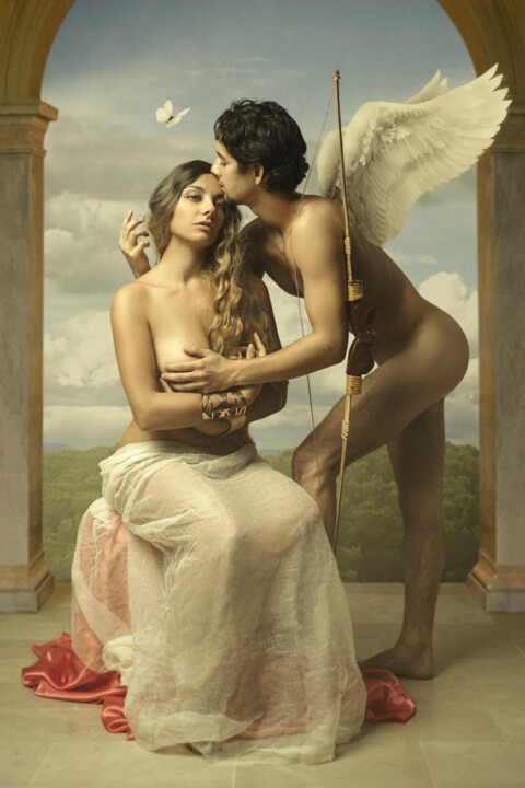 Крылатый юноша, обнаженный, целует лоб девушки, лаская одной рукой кожу ее груди. В классической обстановке появляются и другие детали: бант, бабочка и лоджия, выходящая на зеленый пейзаж. Вы узнаете этих двух персонажей? Это Амур и Психея, что связывает фотографию Оскара со знаменитой и древней традицией исторической живописи. Важно уточнить, что историческая живопись отличается от исторической живописи, которая имеет дело с историей в строгом смысле слова, за пределами мифологических, религиозных и аллегорических повествований. Амур и Психея действительно являются персонажами греческого мифа, известного нам прежде всего по «Метаморфозам» Апулея, где рассказана история счастливой любви, широко переосмысленная в историко-художественном повествовании, завершившемся одноименным шедевром Кановы. Теперь, говоря об Оскаре, родившейся в Париже в 1980 году, она разносторонняя художница, чья карьера началась с глубокой страсти к живописи, подпитываемой ее опытом в области истории искусств. В своем творческом пути она перешла от живописи к графическому дизайну, и в конце концов в 2013 году она занялась фотографией. В своих фотографиях Матильда умело переплетает свою любовь к великим стилям романтизма и неоклассицизма, часто включая в свои образы сложные декорации, костюмы и аксессуары. работа. Более того, иногда она погружается в сферу цифрового творчества, добавляя современный оттенок своим классическим вдохновениям.