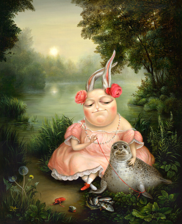 Антропоморфный гигантский кролик тихо сидит у пруда, уделяя исключительное внимание тому, что делают ее руки, а затем и глаза: держит на поводке домашнего тюленя, который позволяет себя баловать, как пуделя. Ясно, что мы находимся в сюрреалистической реальности, потому что то, что мы видим, рационально невозможно, хотя оно и повторяется. Фактически, если мы посмотрим на все работы Айзена, мы заметим, что длинноухий персонаж часто появляется, как повторяющийся мотив, почти напоминающий сверхъестественный и детский мир Шагала, где такие персонажи, как странствующий еврей и скрипач, изображались чаще. чем один раз. Точно так же кролик Айзена сталкивается с множеством приключений в сложном графическом повествовании, часто сопровождаемом странными домашними животными или фигурами, похожими на близнецов. Однако в ряде случаев творчество художника ориентируется и исключительно на жанр натюрморта, где живые животные предстают в сбалансированных предметных композициях. Ирена Айзен — российская художница, в настоящее время проживающая в Израиле, которая обнаружила в себе страсть и склонность к искусству еще в раннем возрасте, так как родилась в семье художников в третьем поколении. Этот контекст определил ее увлечение живописью с десятилетнего возраста, и позже она продолжила свое художественное образование в Ярославском художественном училище в Ярославской области, Россия.