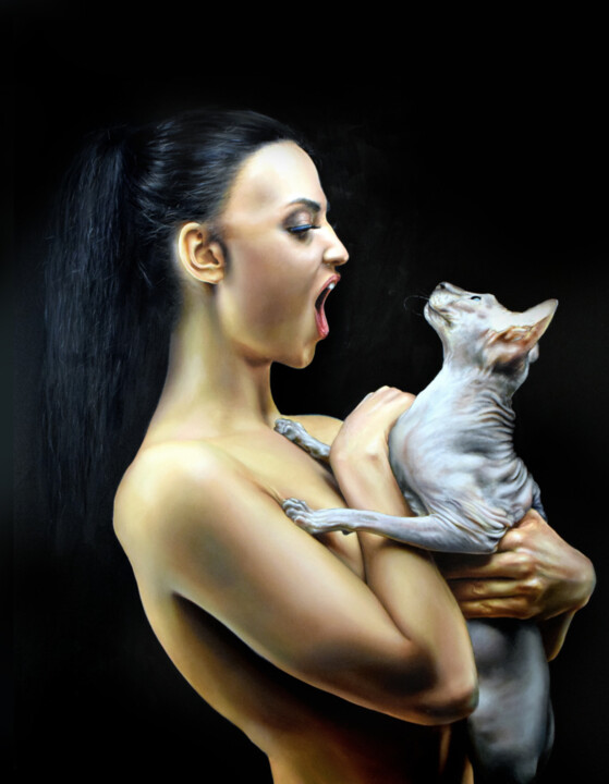 Вы когда-нибудь разговариваете со своими домашними животными? Вы когда-нибудь брали их в руки, смотрели им в глаза и издавали изо рта животные звуки, пытаясь с ними общаться? Я могу без всякого стыда признаться, что действительно веду искренние разговоры со своей собакой, которая, я совершенно уверен, имеет все инструменты, чтобы понимать и интерпретировать ее по-своему. Почему я говорю эти вещи? Потому что работы Духаджа, благодаря своему гиперреализму, напрямую перенесли меня в реальную жизнь, напоминая мне меня самого, мою собаку, а также всех людей, которых я видел, живо взаимодействующих со своими питомцами. Если говорить о гиперреализме, то он представляет собой относительно молодую форму художественного поиска, основной целью которого является создание иллюзий, подчеркивающих и увеличивающих окружающую действительность. Для достижения этой цели художники-гиперреалисты используют интенсивность цвета, освещение, контраст и резкость, чтобы создавать изображения, которые кажутся более яркими, чем то, что мы обычно воспринимаем невооруженным глазом. Что касается Духая, современный венгерский художник находился под глубоким влиянием выдающихся деятелей истории искусства своей страны, взращивая глубокую страсть к цветам и формам, а также эфемерную суть моментов с юности. Хотя на ранних этапах своей карьеры Духай стремился подражать таким мастерам, как Иштван Шандорфи, Жолт Бодони, Ласло Ньяри и Тибор Чернус, его более позднее внимание сместилось в сторону изображения человеческой фигуры, используя язык, представляющий собой смесь реализма и гиперреализма.
