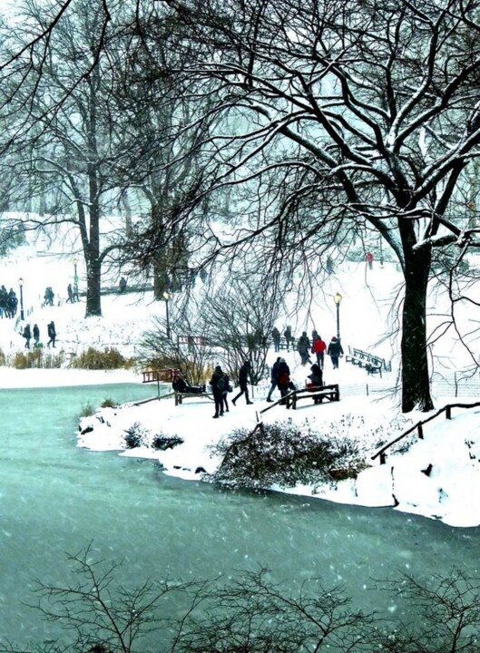 До сих пор мы привыкли видеть ассоциацию снега с коньками, которая в контексте выбранного мною современного искусства будет отведена для демонстрации вариаций, в которых фигуративное искусство изобразило самое белое время года. Фотография Кена Лернера представляет нам Центральный парк (Нью-Йорк), преимущественно покрытый снегом, где разбросаны некоторые персонажи в тяжелой одежде, некоторые статичны, а другие идут, вероятно, направляясь к вершине фотографической опоры. Чтобы связать фламандскую тему с темой художника Artmajeur, я подумал упомянуть некоторые из известных мест, где можно покататься на коньках в американском мегаполисе, в том числе каток Рокфеллер-центра, Зимнюю деревню Банка Америки в Брайанте. Парк-Ринк и, конечно же, каток Уоллман в Центральном парке! Здесь мы можем представить себе другой вариант того же кадра, более похожий на работы вышеупомянутых мастеров. Они были одинаково известны тем, что исследовали зимний пейзаж даже без фигуристов, как это видно из работ знаменитого Брейгеля, который также создал «Избиение невинных», «Поклонение волхвов в зимнем пейзаже» и «Перепись в Зимнем пейзаже». Вифлеем».