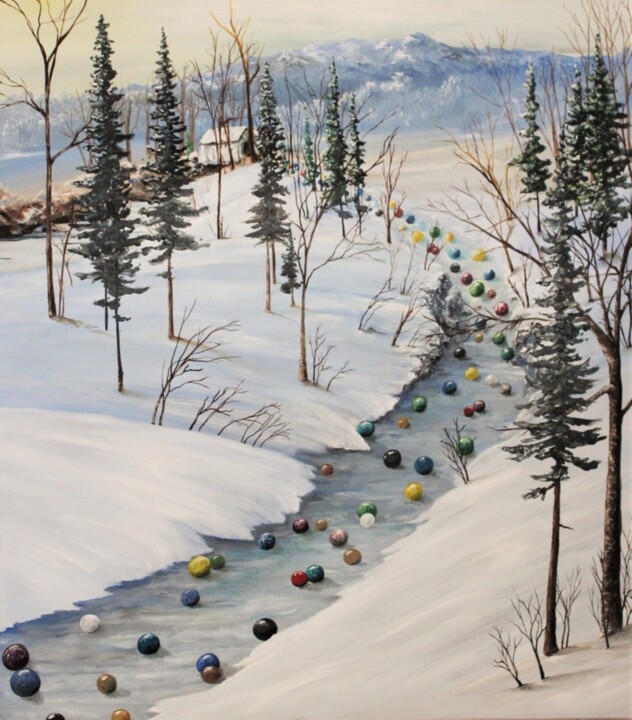 Что бы произошло, если бы мы нарисовали заснеженный зимний пейзаж, прерываемый лишь небольшой замерзшей речкой, но недоступный для катания на коньках? Кто мог восполнить это отсутствие, ощущаемое холстом в условиях отсутствия большего динамизма, а также утраты богатого разнообразия форм и красок? Художница Artmajeur Тэмми Готро, которая отвечает на наши вопросы, хотела «восполнить» этот недостаток, заменив фигуристов динамизмом нескольких разноцветных мячей, которые все спускаются сверху вниз по картине, напоминая своего рода спуск с горных вершин. в долину. Однако художник уточняет назначение этих замороженных сфер, показывая, что они действительно спускаются с ледяного склона, чтобы пройти по продуваемой ветрами холодной лесной тропе. К этим разъяснениям художник добавляет вопрос, размышляя, куда в конечном итоге могут направиться шары. Не имея возможности ответить на свой вопрос, он предполагает, что, как и Красная Шапочка, сферы, возможно, даже направляются в дом бабушки…