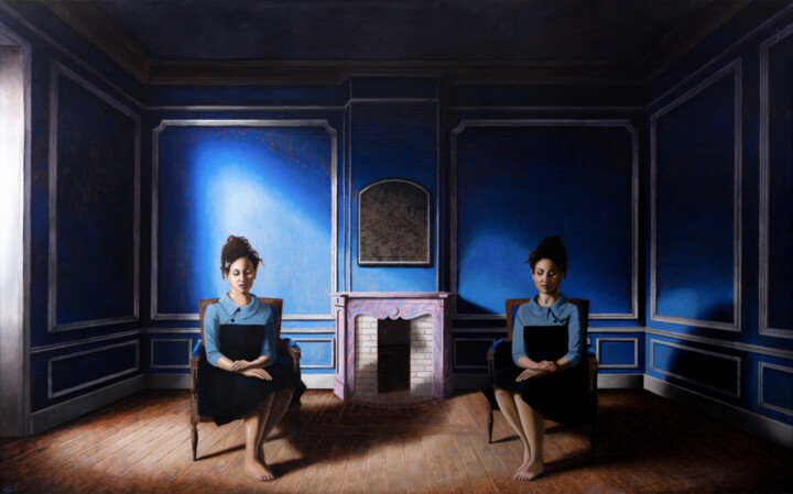 Однако то, что отличает эту современную реинтерпретацию от традиционного фламандского интерьера, — это способ трактовки человеческой фигуры. В отличие от фламандских работ, где люди были погружены в повседневные жесты, в Le Désert Bleu две женщины, присутствующие в сцене, выглядят скорее как символические проекции, чем как повествовательные субъекты. Идентичные по одежде и позе, они сидят по разные стороны композиции в статичной и поглощенной позе, их глаза закрыты, как будто подвешены между реальностью и внутренним созерцанием.