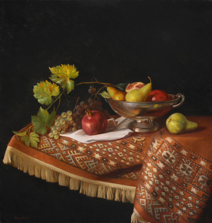 В работе «Урожай» Татьяны МакВети мы можем наблюдать использование сильной светотени, типичной для фламандской живописи, которая усиливает объем предметов и создает ощущение драматической глубины. Расположение предметов на столе — где фрукты, кажется, почти выливаются на зрителя — напоминает барочные композиции Франса Снейдерса и Яна Фейта. Кроме того, включение богато украшенной скатерти и отражающих материалов, таких как металлическая чаша, вызывает в памяти тщательное внимание к деталям, характерное для фламандских мастеров.