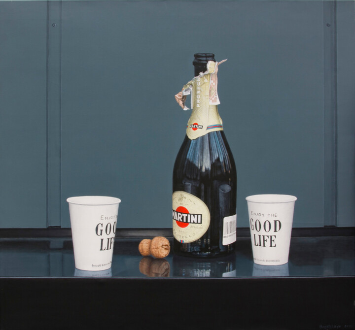Точно так же Наталия Багацкая демонстрирует необычайное мастерство передачи деталей в своей картине «Просто мартини», изображающей открытую бутылку, пробковую крышку и два бумажных стаканчика на столе, намекая на момент после окончания большой вечеринки. Но что делает эту сцену ощутимой? Как может жаждущий зритель почти смутиться и потянуться за бутылкой? Багатская использует сочетание акрила и лака на холсте, чтобы воспроизвести отражения на глянцевой поверхности бутылки и текстуру бумажных стаканчиков — тщательная техника, которая делает видение чрезвычайно реалистичным.