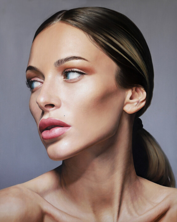 Картины «Доверенное лицо» Фабиана Бертона и «Взгляд» Андрея Брыжака предлагают четкое различие между реализмом и гиперреализмом. Первая реалистическая картина изображает женщину с напряженным и проницательным выражением лица, устанавливающую эмоциональную связь со зрителем, сидящую на стуле в изящно вышитом белом платье. Напротив, в картине Брыжака «Взгляд» лицо другой женской фигуры показано крупным планом с такой точностью, что оно напоминает фотографию: кожа модели передана безупречно, с тщательной детализацией и необыкновенным «реализмом». Однако женщина смотрит влево, избегая более реалистичной, напряженной и тесной связи со зрителем.
