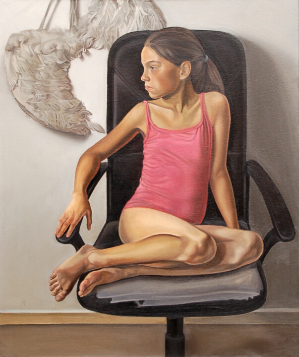Одновременно в «Девушке с крыльями» Роман Рембовский изображает молодую девушку в розовом боди, сидящую в несколько «личной» позе на черном офисном стуле. Позади нее висящие на стене пернатые крылья предполагают сказочный или символический элемент, призванный передать самоанализ и спокойствие в рамках тщательной и точной масляной композиции (см. Детали тела и выражения лица девушки).