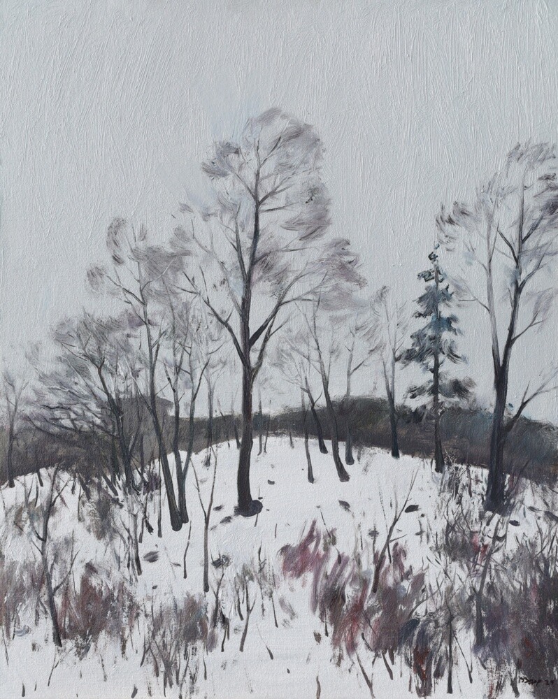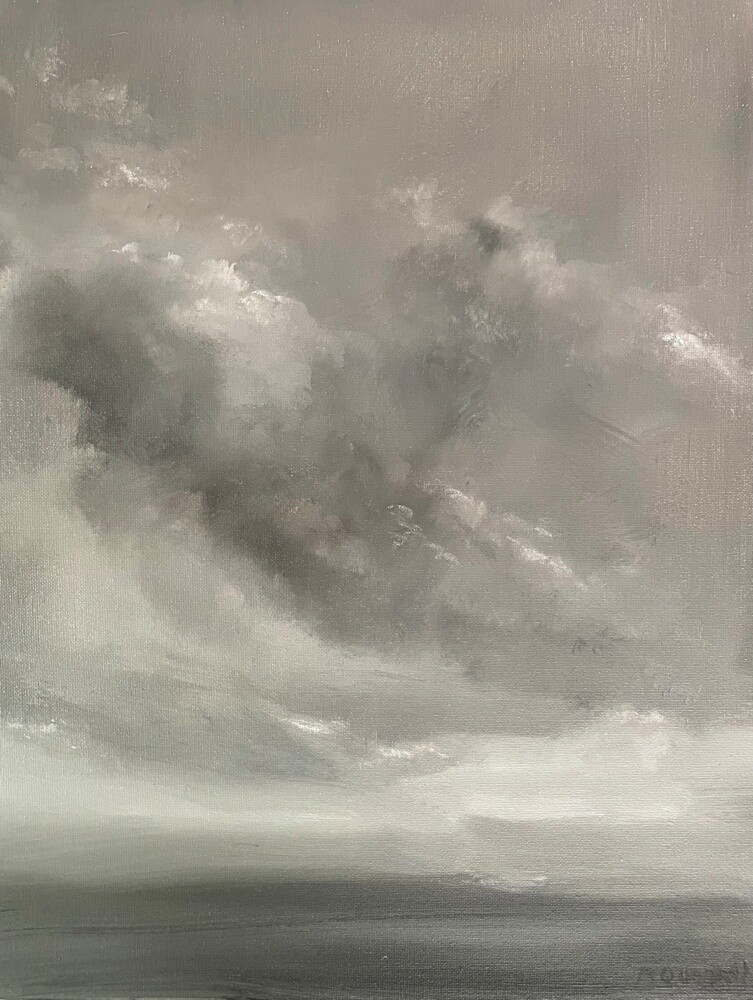 Канадский художник, с другой стороны, использует серый цвет более «классическим» образом, используя его оттенки для создания более реалистичного, драматичного и рефлексивного атмосферного эффекта. В работе «Windblown», вдохновленной дождевыми облаками, уносимыми ветром, этот цвет становится средством для выражения меланхоличных и медитативных настроений. Также стоит отметить, что полотно является частью монохромной серии, где серый цвет играет центральную роль в создании эмоциональной связи между сценой и зрителем.