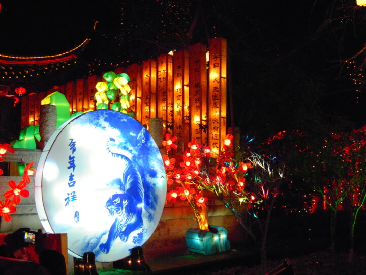 Выставка фонарей . Традиция выставлять фонарики восходит к династии Суй в шестом веке. При династии Тан представления стали грандиознее, комендантский час был отменен, что позволило людям наслаждаться фонарями днем и ночью. Сегодня в городах по всему Китаю проводятся грандиозные ярмарки фонарей, ярким примером которых является Парк культуры Чэнду. Современные фонари включают электрические и неоновые конструкции, а также традиционные бумажные или деревянные фонари, подчеркивая сочетание исторических и современных элементов фестиваля.