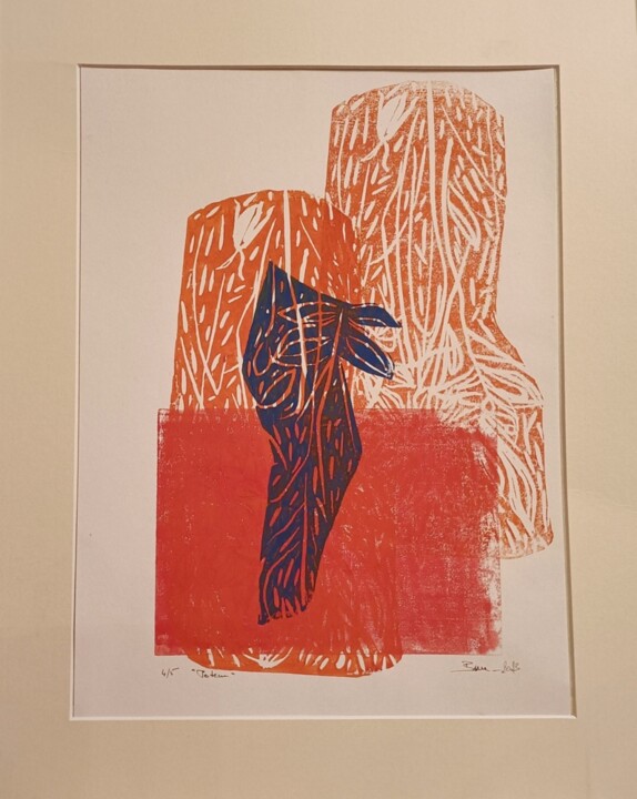 Техника линогравюры позволила Де Нуэлю Имберу детально исследовать повторение и изменение форм. Работа представляет собой абстрактную композицию с перекрывающимися органическими и геометрическими мотивами. Доминирующие цвета — оранжевый и синий, создающие сильный визуальный контраст. Оранжевые формы вызывают в памяти природные особенности, похожие на листья, в то время как центральная синяя фигура добавляет элемент глубины и сложности. Использование ярких цветов и повторяющихся узоров придает работе ощущение движения и динамизма.