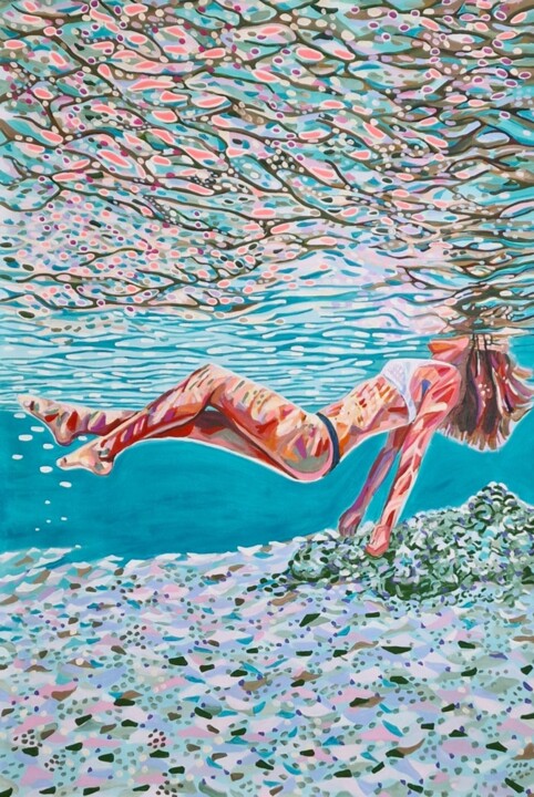 Тема моей последней работы — подводный мир, подводный мир с центральной человеческой фигурой. Стиль — это сочетание фигуративности и абстракции в акриловой технике на самом большом формате, над которым я когда-либо работал.