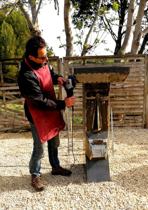 Я уже автор детективных романов, фотограф и создатель деревянных открыток. Скульптура появилась во время первых родов; Я хотел сделать жене подарок и сделал свою первую скульптуру для сада: стилизованный Моаи с острова Пасхи, высотой 1,30 и весом 60 кг из стали.