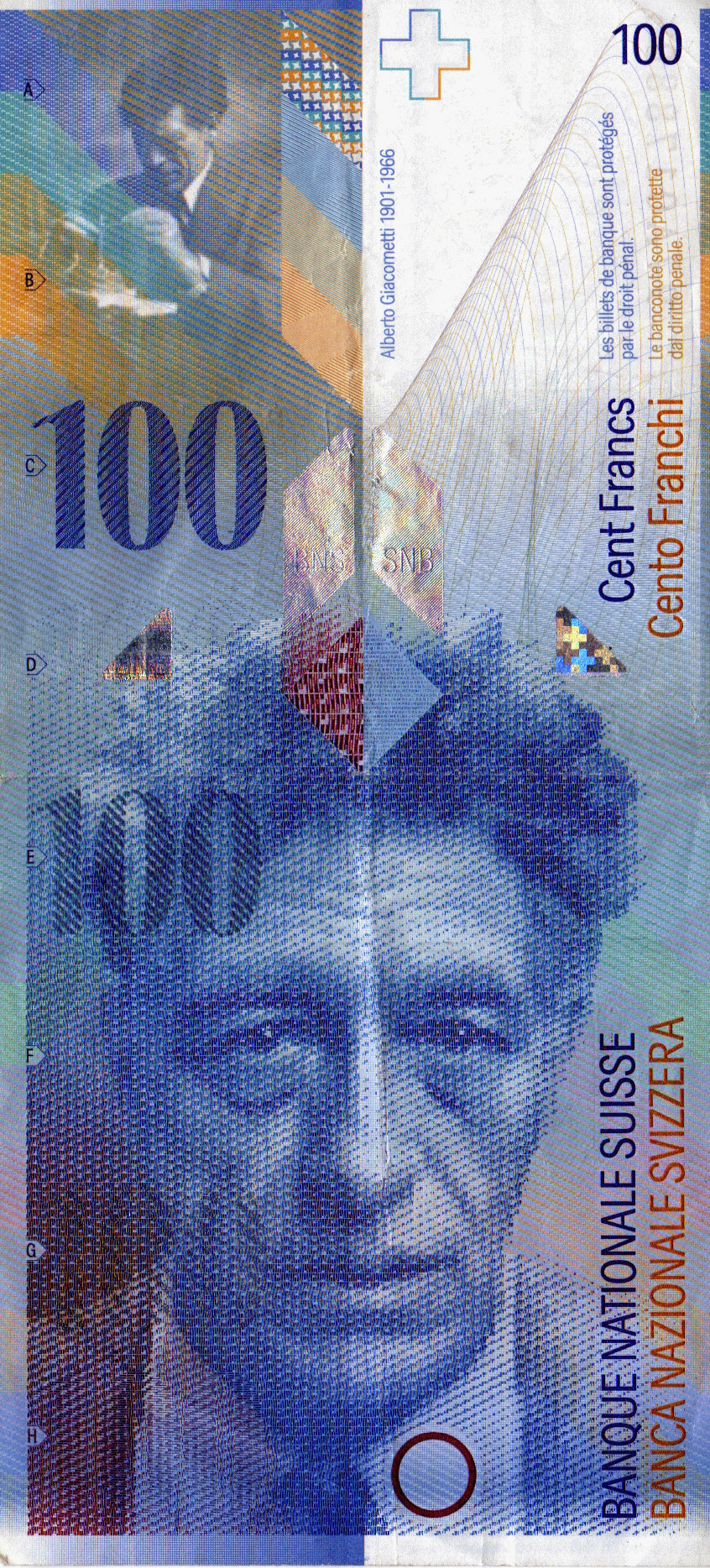 Alberto Giacometti and a reproduction of his sculpture in Switzerland 100 Francs