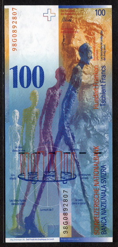 Джакометти, как известно, был чрезвычайно самокритичен, что мотивировало его плодотворную и обширную карьеру: «Чем больше вы терпите неудачу, тем больше у вас успеха». На одной ноте в 100 швейцарских франков изображен портрет Джакометти с одной стороны и его репродукция скульптура «L’Homme Qui Marche» 1961 года с другой.