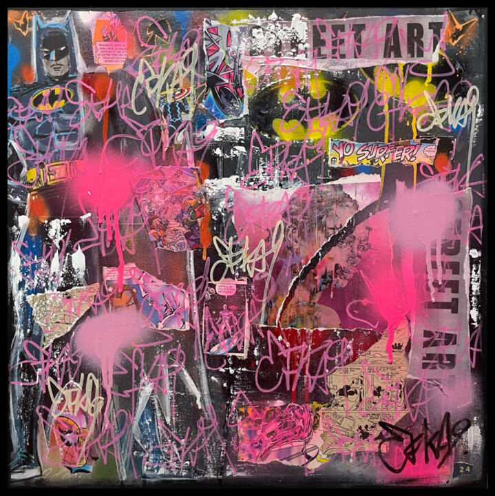 Одной из особенностей моей работы является техника смешивания; акрил, аэрозольная краска, Posca, маркеры, коллажи, ручки, типекс… это не очень академично — я полностью самоучка — но важен только результат! В конечном итоге слои перекрываются, и в зависимости от освещения картины раскрывают разные грани. Это делает мою работу чрезвычайно современной, но затронутые темы вечны.