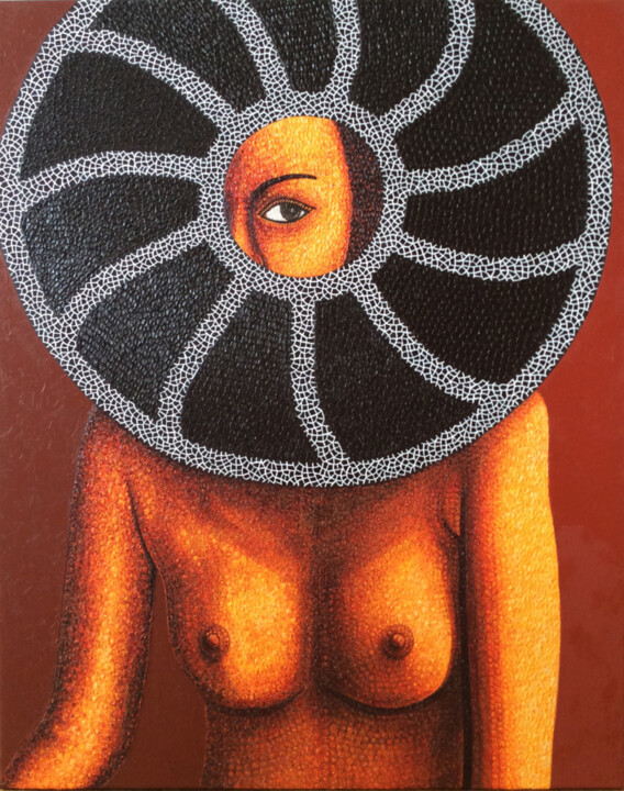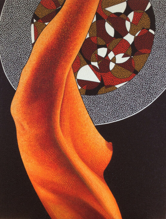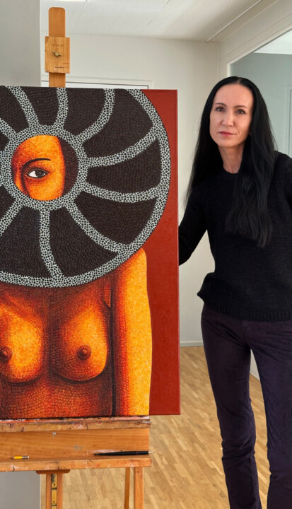 Для меня важно создать отличительную технику. Это моя подпись, она должна быть моей визитной карточкой, моей торговой маркой, так сказать. Работаю исключительно масляными красками. Я использую специальную технику кисти, при которой краску для основной части работ – для основного высказывания – формирую кистью в маленькие кружочки или точки. Через их разные оттенки я формирую телесность/трехмерность, а они создают основное изображение как крупные пиксельные точки. В результате создается пластический рельеф. Напротив, на гладко нанесенном фоне — графические орнаменты из точных тонких линий, нанесенных очень тонкой кистью. Картины состоят из нескольких слоев краски. Это очень трудоемкий и трудоемкий процесс…