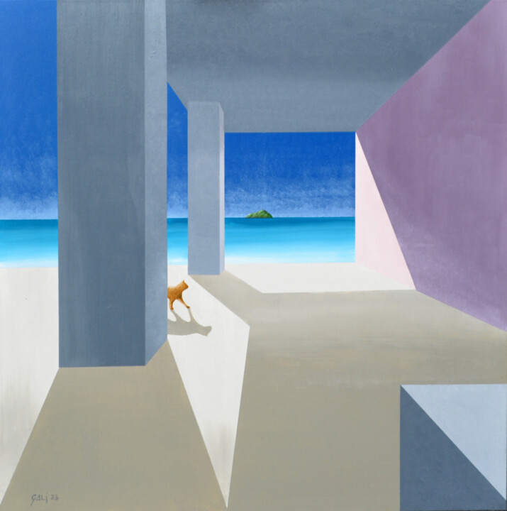 Текущая тема, которая часто повторяется, — это пейзаж, состоящий из простой архитектуры на переднем плане, подчеркнутой тенями, и моря на заднем плане. Объекты лишены любых элементов, которые могут нарушить их чистую форму, в попытке добраться до сути.