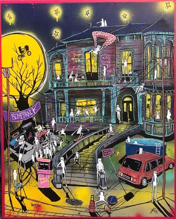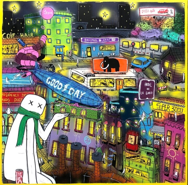 Я всегда начинаю с того, что делаю фон с бомбой (которая дает почти естественную яркость), размещая основные элементы (здания) и все источники света. Я продолжаю с Posca и акриловой краской.